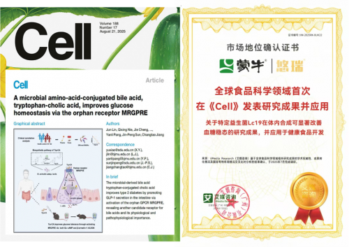 最具代表性的突破,是蒙牛自主研发的副干酪乳酪杆菌Lc19及其清晰的机制阐释。科研团队首次揭示该菌株可通过特定代谢物激活人体内一个全新的受体MRGPRE,从而安全、有效地调节血糖。这项具有里程碑意义的原创性应用基础研究,已发表于国际顶级期刊《Cell》,是全球食品科学领域首篇获该刊收录的应用型成果。基于这一精准机制,蒙牛推出悠瑞安糖盾益生菌粉,为血糖健康管理提供了新一代解决方案,该产品也荣获本次峰会“年度控血糖益生菌创新奖”。